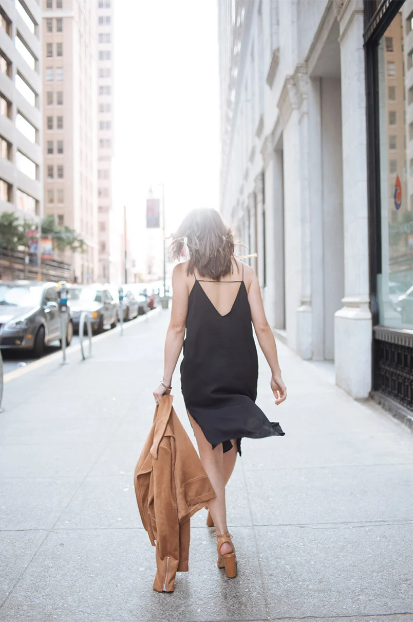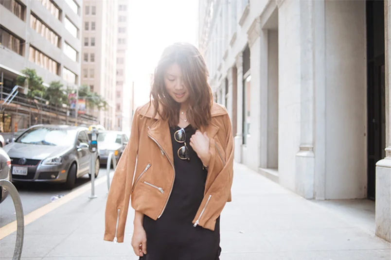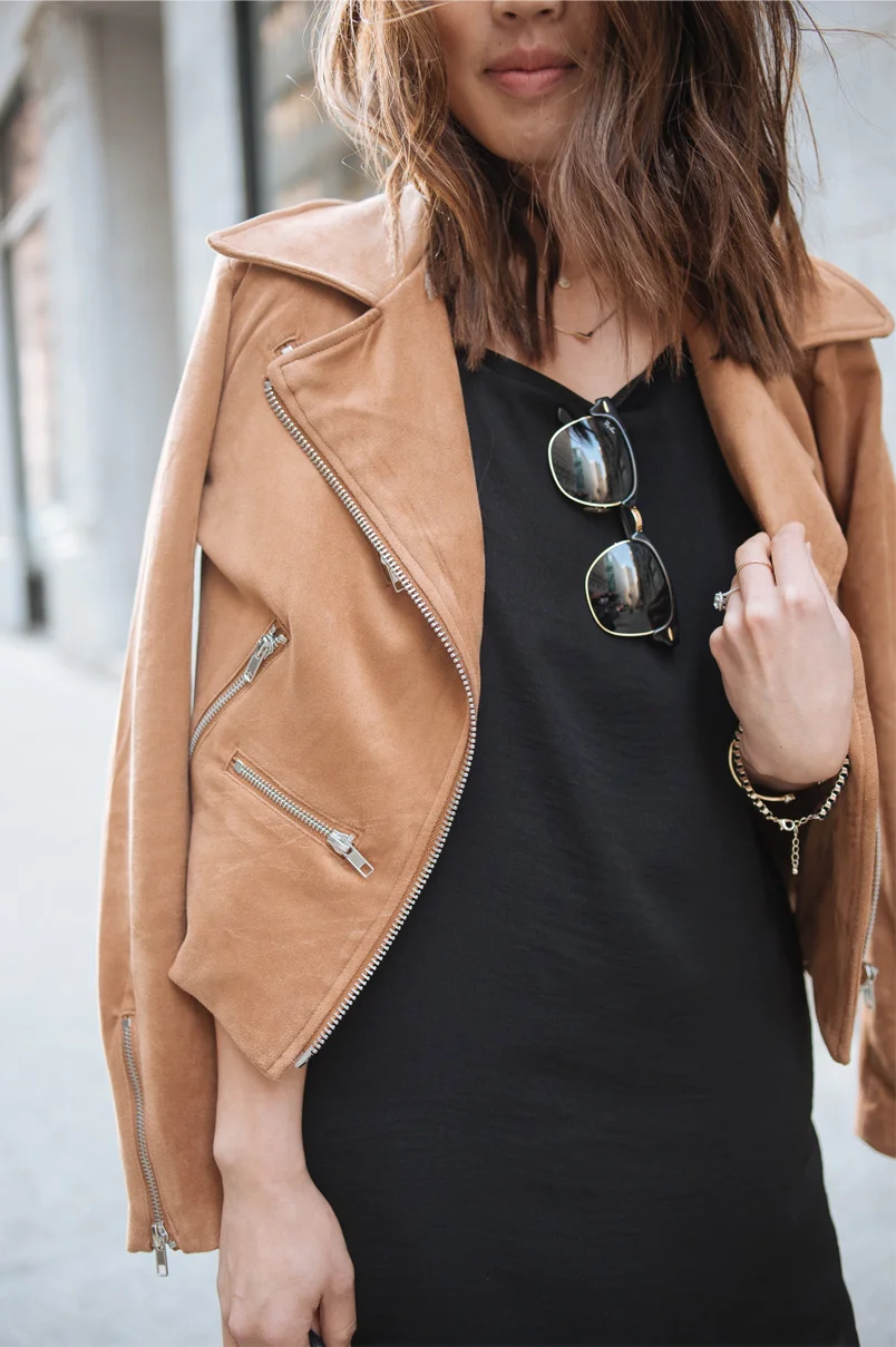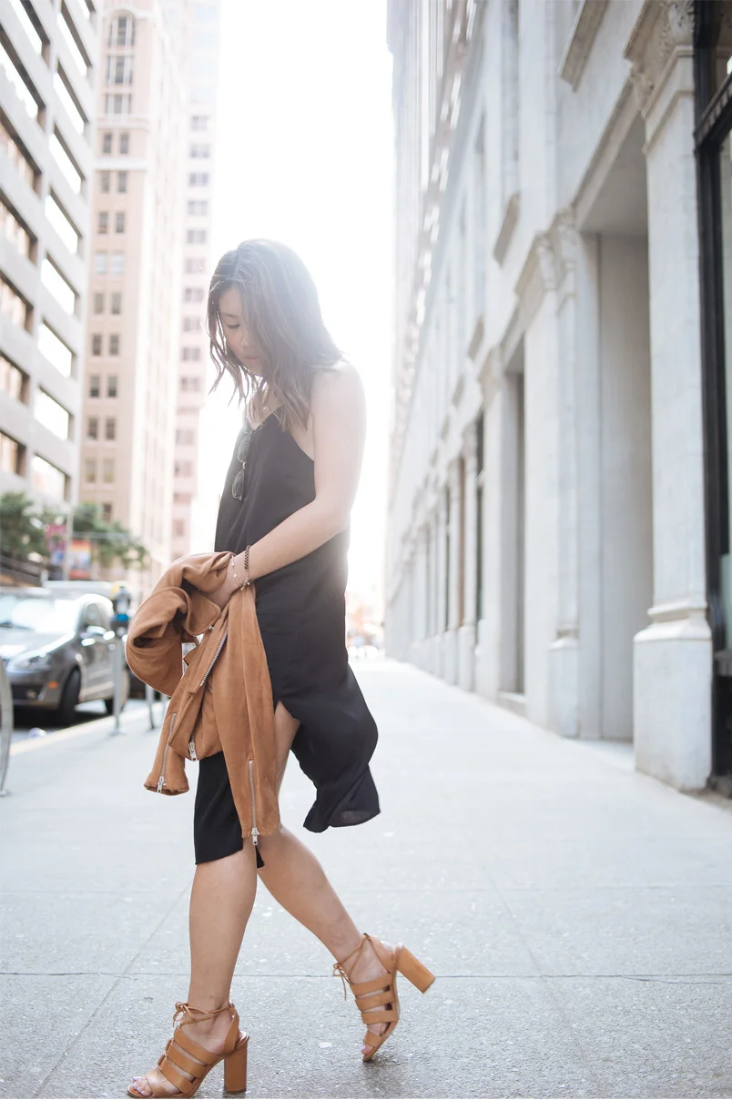 The kind of outfit that take the least amount of pieces and seconds to put together always end up to be my favorite ones. If I had to describe my style formula, it would reflect the items I'm wearing here - a silk cami dress with my latest love, this smooth faux-suede moto jacket. Feminine flair with a touch of edgy details. It's the perfect outfit to say bye to Summer and hello to Fall in.